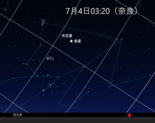 金星がおうし座のなかを移動していきます。7月4~5日ごろにはプレアデス星団の(赤緯でいうと)約8°南に金星があり、そのあいだに天王星もあります。金星と天王星の距離は7月5日で約3°です。