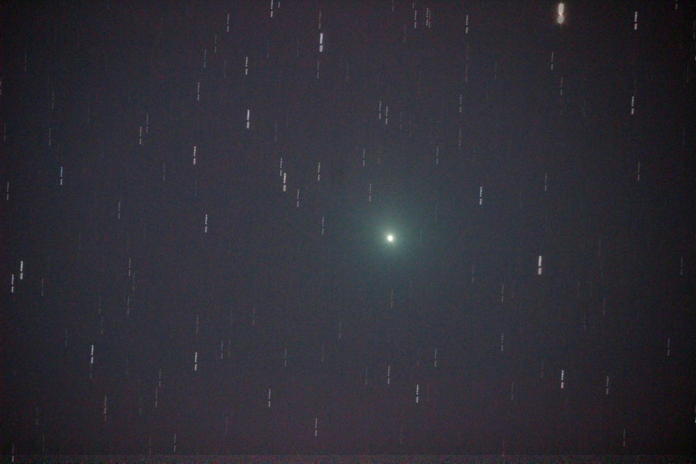 なかなか晴れないので、月明かりがあるのを承知で観測所に行きました。家を出発する前に、気象衛星の画像を何回も見て、晴れ間が来ることを確信(期待)して出かけました。期待通り、午後9時前に着いたら快晴でした。彗星は地球に接近していて動きが速く、感度を上げて25秒の短時間露出で撮影しました。彗星は22cm反射60倍で、中央集光の強い拡散状です。