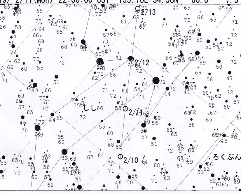 奈良での月の出は、2月21日には19:40ごろ、22日には20:50ごろと、どんどん遅くなります。月が上ってくる時刻まで観測に適します。22日20時の彗星の高度は86度で、ほとんど天頂です。太陽との位置角も変化して、尾も伸びてくると期待されます。これから減光していくので、なるべく早い時期に観測(撮影)しましょう。各日、午後9時の彗星の位置は下の星図の通りです。