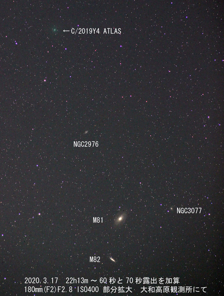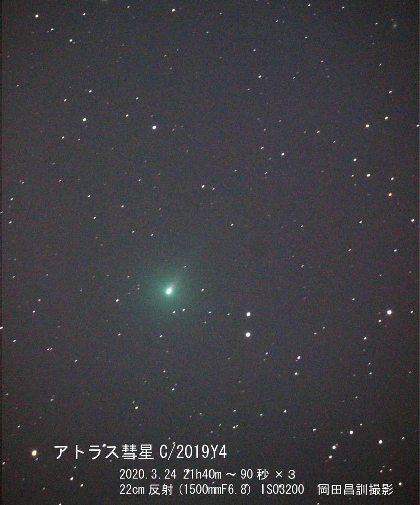3月は17日、20日、24日に観測所に行きました。24日は雲が多かったものの、晴れ間の透明度はよく、C/2019Y4アトラス彗星のみ撮影しました。21hに着いて22h過ぎに撤収する早業?でした。彗星は22cm反射望遠鏡60倍でこの日がもっともはっきりと見えました。円形の拡散状で、9~10等です。写真では細い尾が伸び始めています。