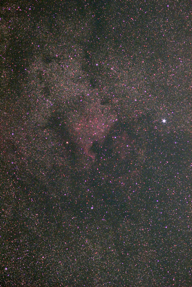 下は100mmレンズで撮った「北アメリカ星雲付近」です。普通のデジカメは赤い星雲が写りにくいので、次のような方法で撮りました。
