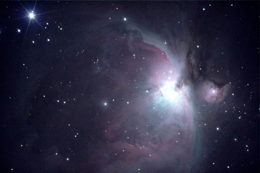 今年はお正月は月明かりがあり、そのあとは寒波来襲で、観測所へ行こうとは思いませんでした。やっと、14日・15日暖かくなって、道路凍結の心配もなくなったので、「利用者ノート」を持って行くついでに?初撮影してきました。透明度はも一つですが、気流は落ち着いてそうなので、いつものカメラと、試しに惑星用の動画カメラでオリオン大星雲をねらいました。オリオン大星雲は、低感度から高感度までいろいろ変えて短時間露出で撮影しました。そのうち高感度で撮影したものを下に紹介します。秒単位の露出でこれだけ写ります。なお、私の動画カメラは感度が低く、星雲は写りませんでした。
