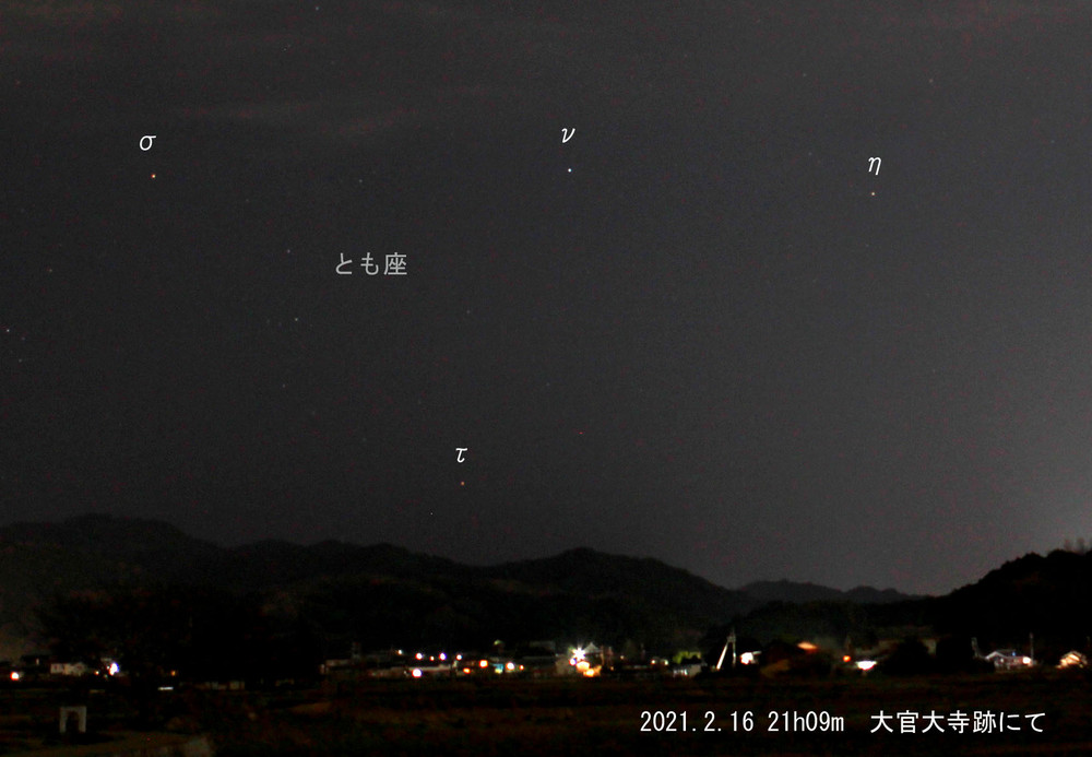 この日は夕方は快晴でしたが、本薬師寺跡に着く頃には雲が出てきて、カノープスは肉眼では厳しかったですが、双眼鏡ではよく見えました。21時をすぎるとまた晴れ間が多くなり、本命?の大官大寺跡では・・・(下の写真をご覧下さい)。明日香村は南の方向に山があり、その高度は3°をちょっと超えるので、カノープスはなかなか見えません。