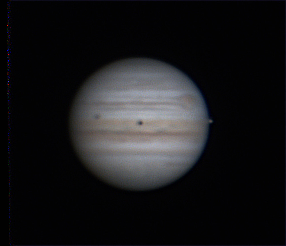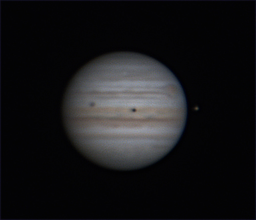 *木星の赤道付近にガニメデ(左)とイオの影?(濃い)木星の右側にイオが写っている