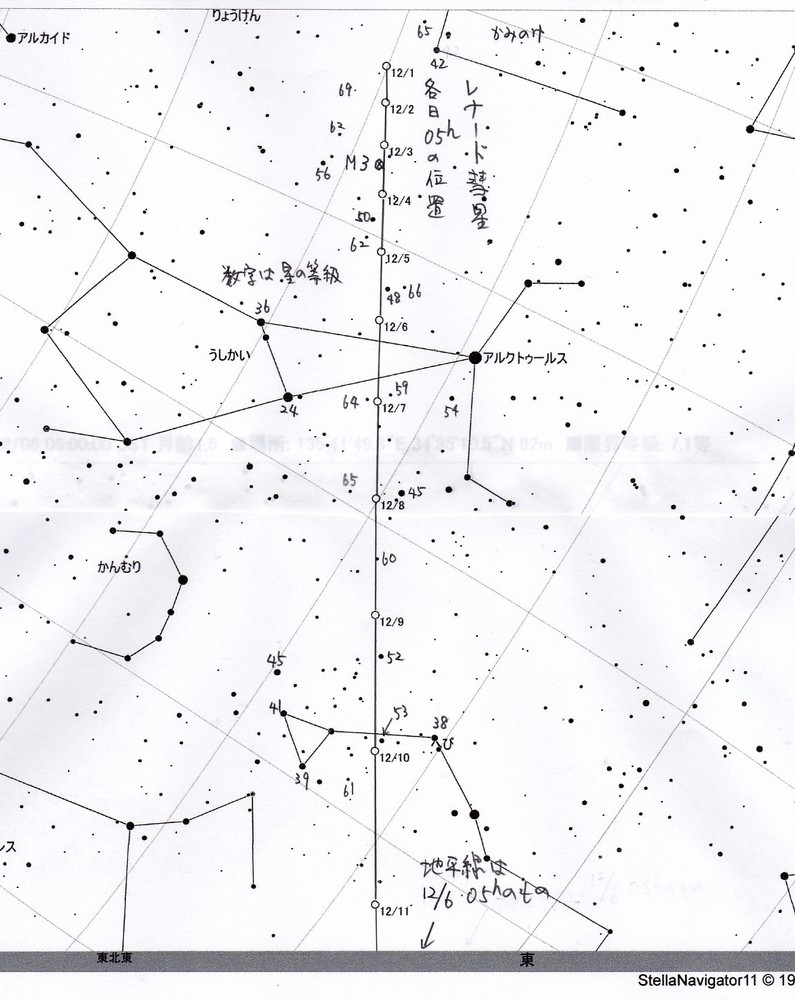 12月上旬の彗星の位置は下図の通りです。この時期は奈良県なら午前5時すぎまで空は暗いです。12月下旬には夕方の西の空に回ってきますが、高度は高くならず夕方での観測条件は良くありません。是非、早起きして明け方の彗星を観察(撮影)してください。