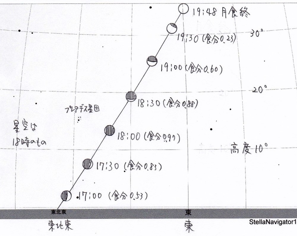 近畿地方では月の出と日の入りの時刻がほぼ同じなので、空が明るいうちに月が上ってきます。また、今回の月は5月の月食よりだいぶ北の方(東北東の方向)から上ってきます。