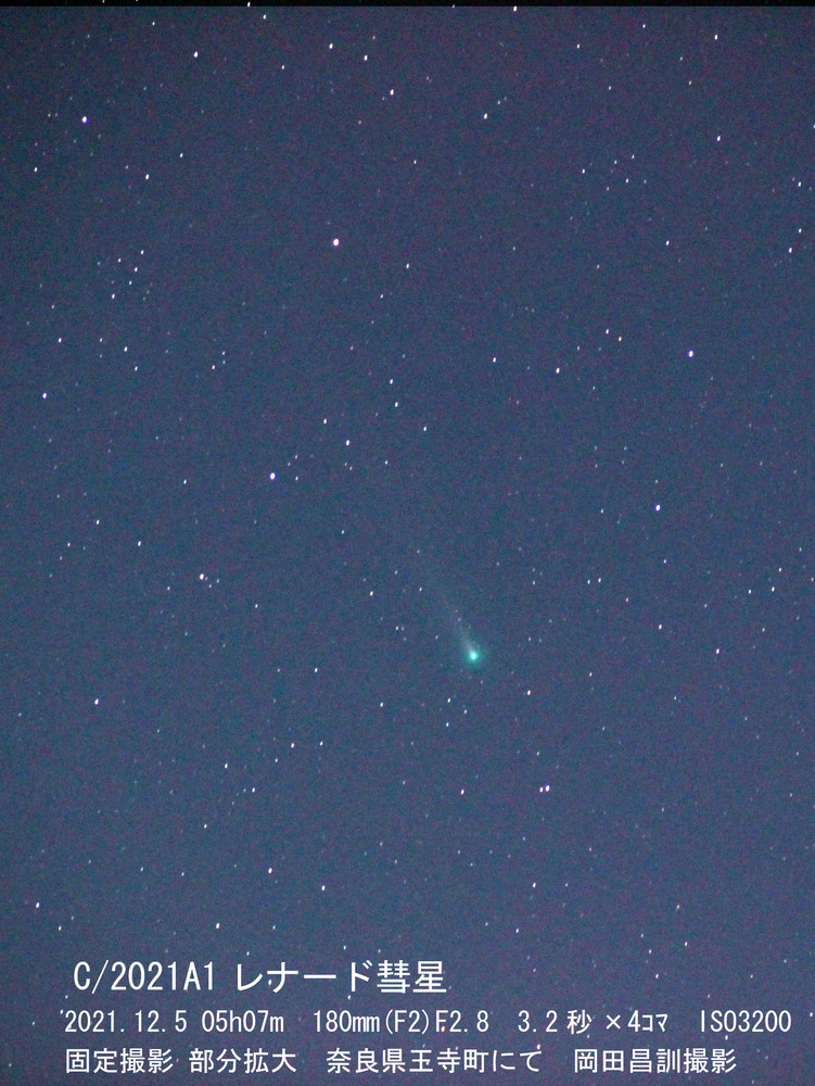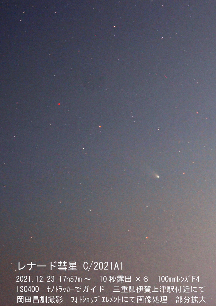 下の写真は固定撮影で撮ったものです。フォトショップエレメントで画像処理をしています。周辺減光の部分をトリミングしたので、フィルムカメラの400mm相当の画角になっています。固定撮影でも尾が写ったので喜んでいます。観測所でなら尾はこれの倍以上の長さに写ったことでしょう。今日は彗星の高度はまだ高かった(40°近く)のですが、これから日に日に低くなっていき、12月11~12日位が限界でしょうか?