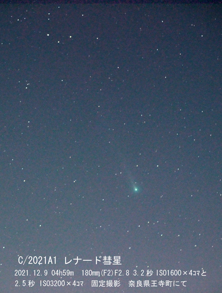 今朝(12/9)も、早く起きて、自宅の2階の窓から観測(固定撮影)しました。今日はもやが出ているようで、透明度が悪く、先日(12/5)と同じISO感度や露出で撮ると、画面が真っ白になってしまったので、1段感度を落とすなどして撮りました。下の写真は何とか尾を出すために8コマコンポジットしています。3.5cm7倍の双眼鏡で最初はわかりにくかったですが、全光度は6.0等と目測しました。インターネットに投稿されている写真では尾が数度に伸びています。