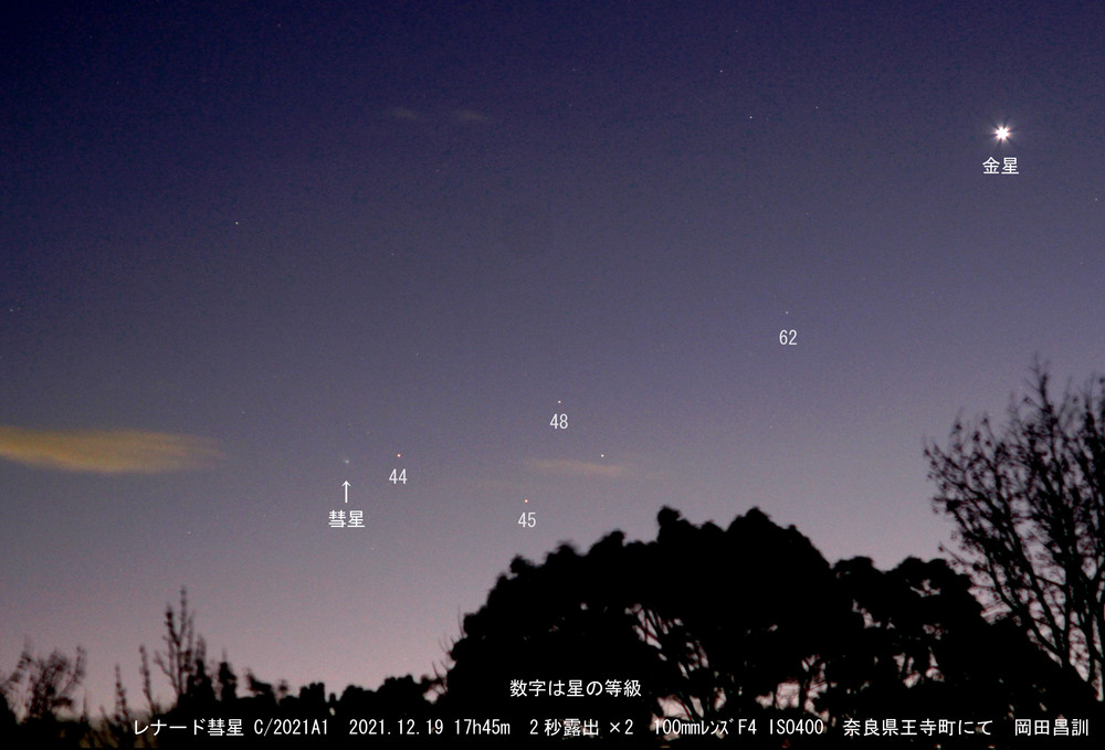 彗星は12月18日には金星の左下にありますが、満月前の月明かりがあります。月明かりなく観測できるのは、12月21日以降です。12月21日の奈良での日没は16:50で、それから1時間後の17:50の彗星の高度は10°しかありません。17時半ごろから18時のあいだに金星を目安に彗星をさがす(写真を撮る)とよいでしょう。なお、関東ではここに記した時刻より20分ほど早いほうが良いです。