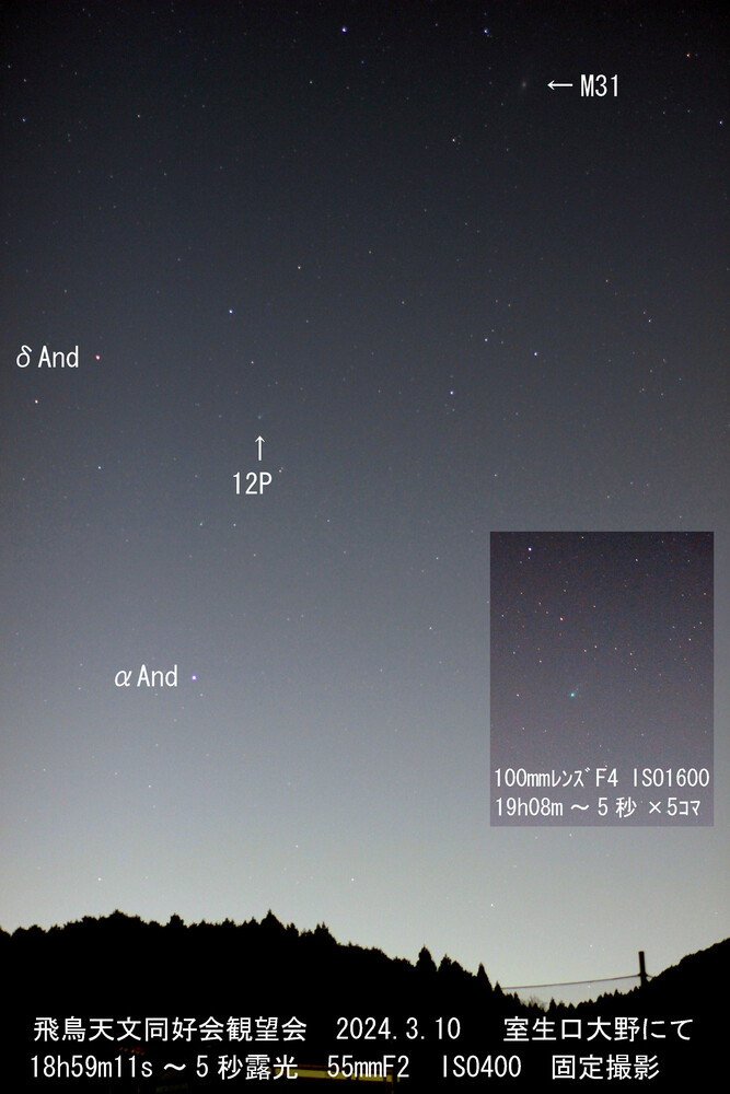 参加された皆さんは、口径3~4cmの双眼鏡をお持ちになっていましたが、ポン・ブルックス彗星は、明るい星からたどっていかないとわからないという状況でした。頭部は恒星がにじんだような感じ(小さい拡散状)に見え、尾はわかりませんでした。彗星の写真を撮っていたのは私(岡田)だけでしたので、写真を紹介いたします。