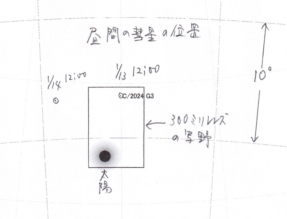 この場所の日没時刻は17:10ですが、実際の太陽は16:48に遠くの山並みに沈んでいきました。7×35の双眼鏡で観察しましたが、昨日彗星が写った時刻になっても彗星は見えません。やっと17時28分に遠くの山に沈む直前の彗星を見つけることができました。比較する星がないので光度はわかりませんが、この時間に見えているので、0等より明るいのはまちがいないと思います。