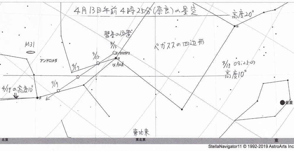 4月13日午前4時25分ごろ(奈良県での時刻)の彗星の高度は15°で、「ペガススの四辺形」の一角にあたるアンドロメダ座アルファ星に1°まで接近します。