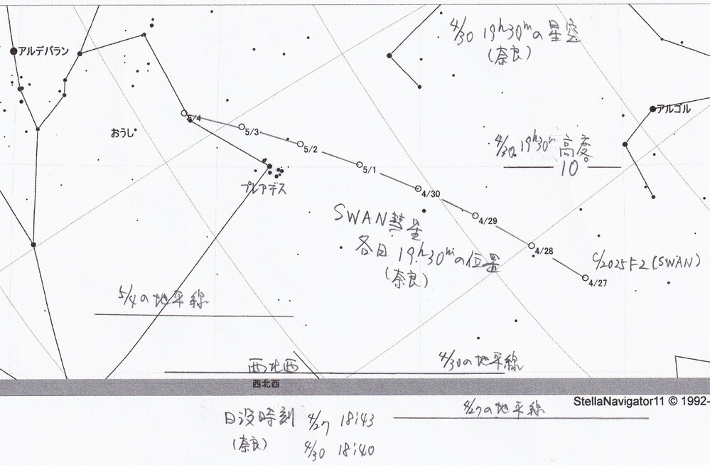 5月1日に近日点通過となるC/2025F2 SWAN彗星は、4月下旬には崩壊した残骸が9~10等で撮影されています。夕方の空に見えてくるはずですが、高度も低いし10等では観測が難しいと思います。いちおう観測用星図を下にあげておきます。
