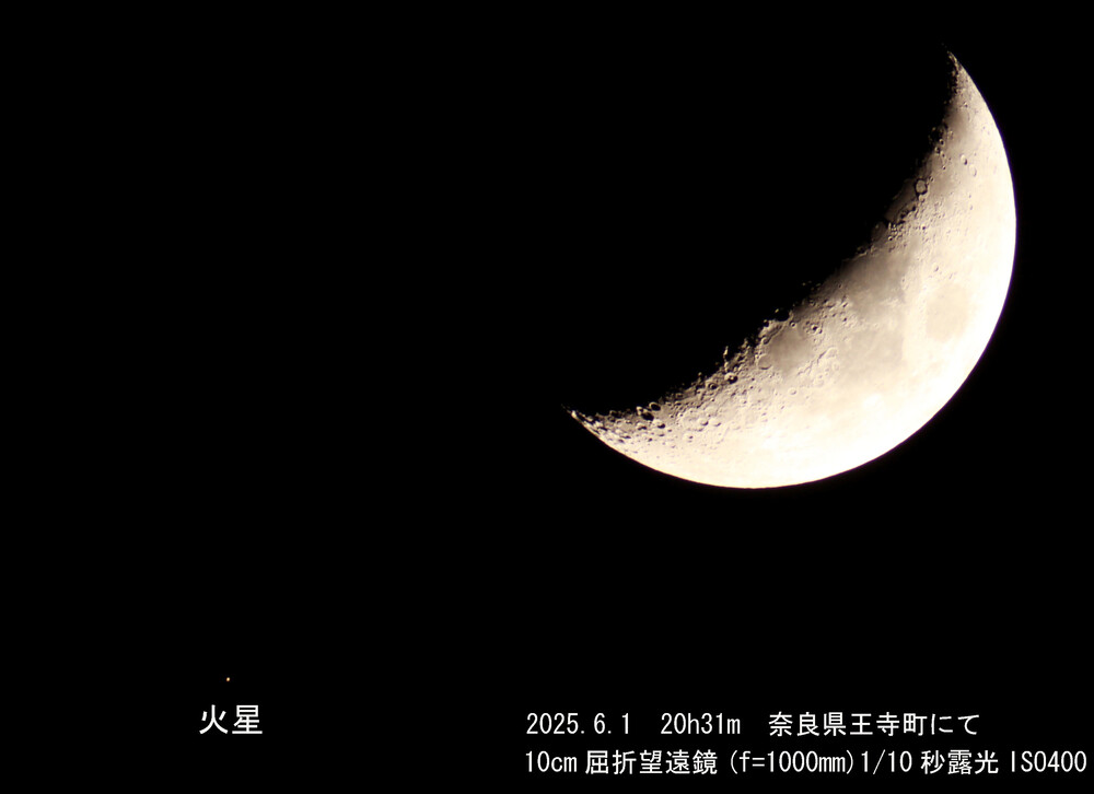 5月下旬は天気が良くなく、天体写真は撮影していませんが、6月に入ってこの日は夕方から晴れました。「6月の観測ガイド」に書いてあった「月と火星の接近」を自宅で撮りました。使った屈折望遠鏡は古いアクロマートレンズなので、口径を7cmに絞って撮影しました。撮影の合間に望遠鏡を覗くと、月のすぐ近くに恒星がありました。あとで調べると5等星のようで、これは月に隠されたようです。(下の写真ではこの星はもう隠れているようです。)
