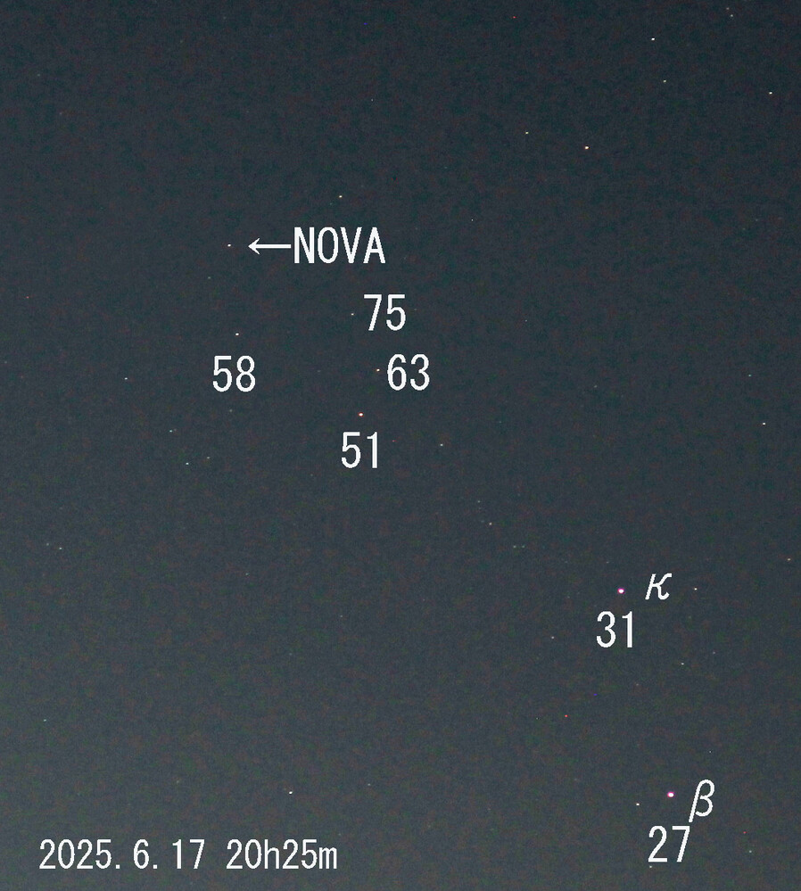 私が自宅近くで、17日に100mmレンズの固定撮影で撮った写真も掲げておきます。数字は星の等級です(58は5.8等)。新星は6等位と思われます。