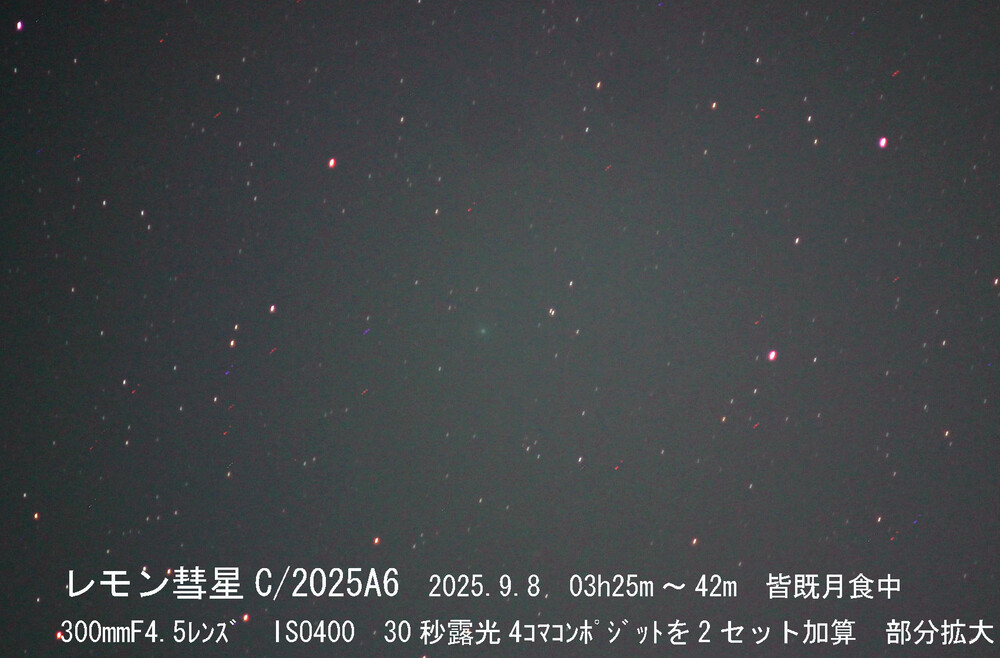 皆既に入って少ししたら終わって寝ようと思ったのですが、良い天気なので、皆既中に東の空のレモン彗星C/2025A6も撮りました。二日前の撮影でP-2架台を組み立ててそのままだったので、便利でした。
