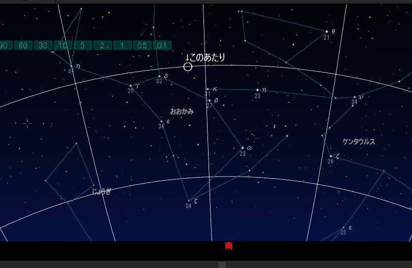 おおかみ座は、ケンタウルス座とさそり座の間にあり、南の空低いのですが、ちょうど午後9時ごろに南中していて、新星の高度は15°位です。おおかみ座βとケンタウルス座Κが縦に並んでいて、この2つの星は双眼鏡で見つけやすいです。そのちょっと左上です。星図は以下の通りです。(ステラナビゲーターで作成)
