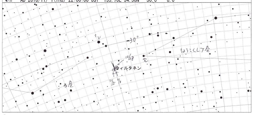 5.4年周期で、今回の近日点通過は12月12日です。そのころ、地球に0.08天文単位まで接近し、3等台になると期待されています。11月はまだ南天(ちょうこくしつ座とろ座の境界付近)にありますが、12月に入ると、一気に北上していきます。