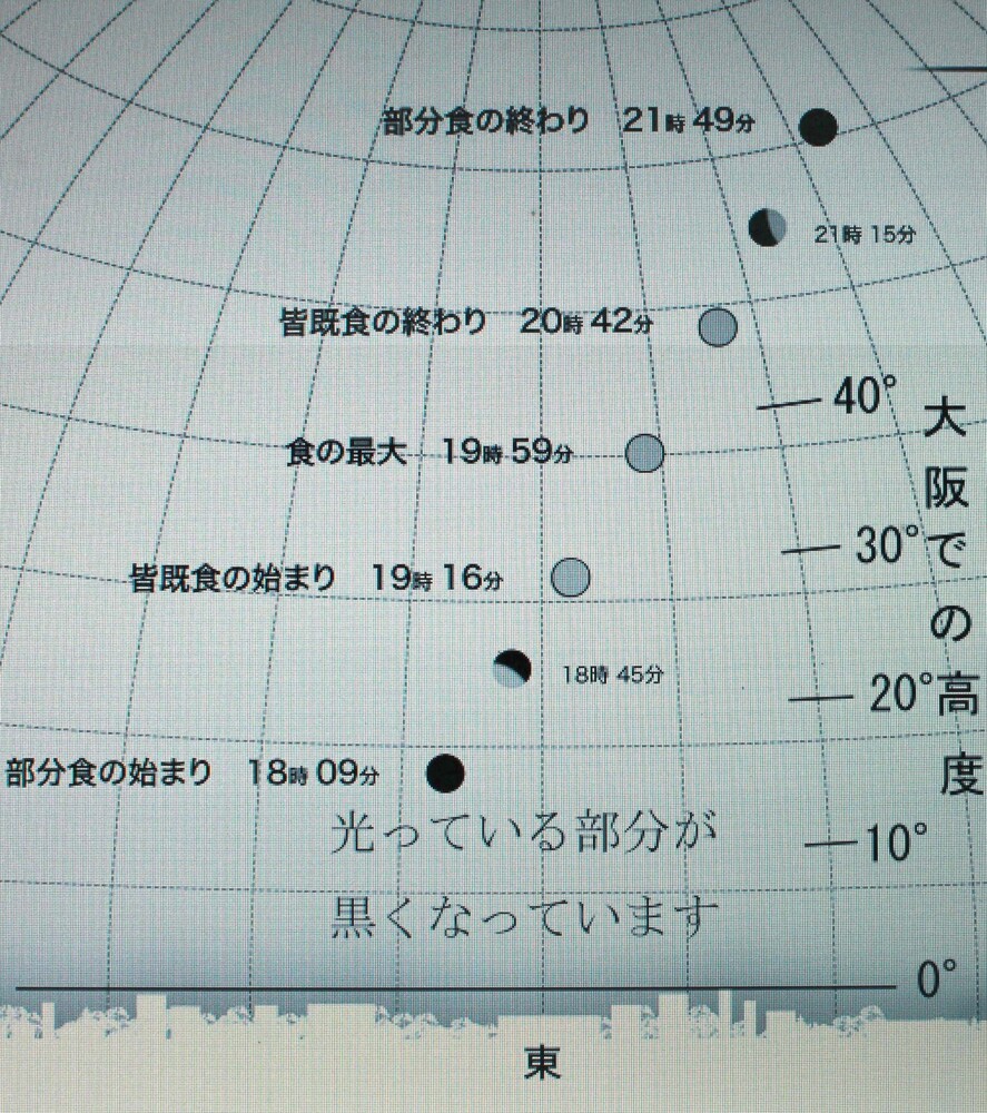 欠け始めや皆既の始まりなどの時刻は全国ほぼ同じで、下の図の高度などの線は東京のものですが、大阪での月の高度を右に入れてあります。