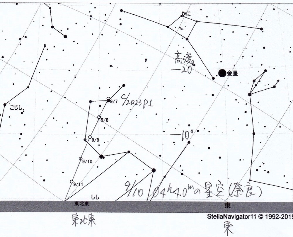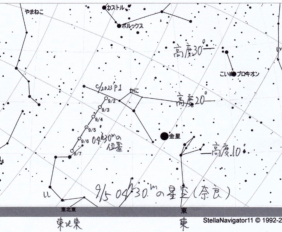 西村彗星C/2023P1 の観測用星図です。インターネットでの情報では、8月末の明るさは約7等、写真では1度以上の尾が写るようです。9月初めは、満月すぎの月明かりがありますが、だんだん影響は少なくなってくるでしょう。金星が目印になります。太陽に近づくので、見られるのは9月10日くらいまででしょうか?