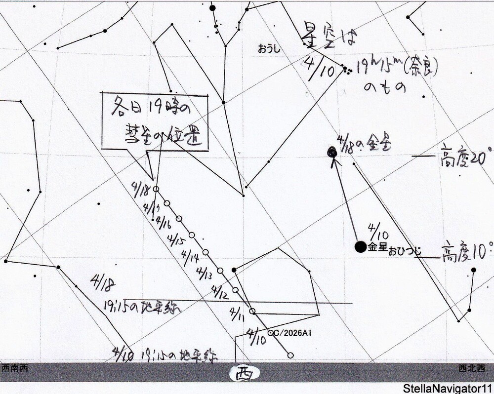 もう見えないと思いますが、万が一彗星の尾だけでも残った場合にそなえて、彗星の位置を示す星図を下に掲げます。丸は彗星頭部の位置なので、もし尾が見えるとすると丸印より左上に伸びるはずです。