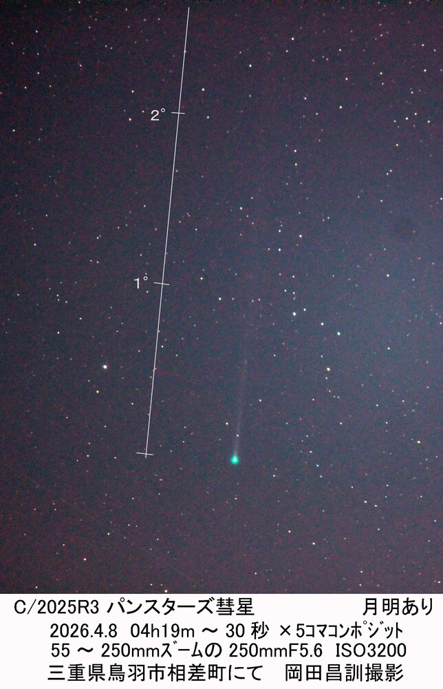 C/2025R3パンスターズ彗星は、星図を見ながらさがすと、3.5cm7倍の双眼鏡ですぐに見つかりました。集光が強く、低倍率では恒星のような感じでした。全光度5.5等と目測しました。下弦の月明かりがありましたが、写真に撮ると長い尾が写りました(下の写真)。今回の撮影はレンズキットの軽いズームレンズをナノトラッカーでガイドしました。